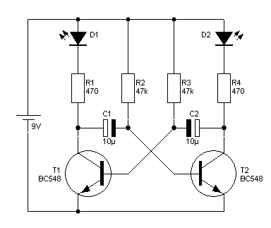 Wechselblinker schaltung schaltplan. Erläuterung zum Schaltplan. Der hier beschriebene Wechselblinker ist ein simpler A-stabiler Multivibrator das heißt die Schaltung kennt keinen stabilen Zustand sondern schwingt ständig zwischen zweien hin und her. Antworten 6 RE.