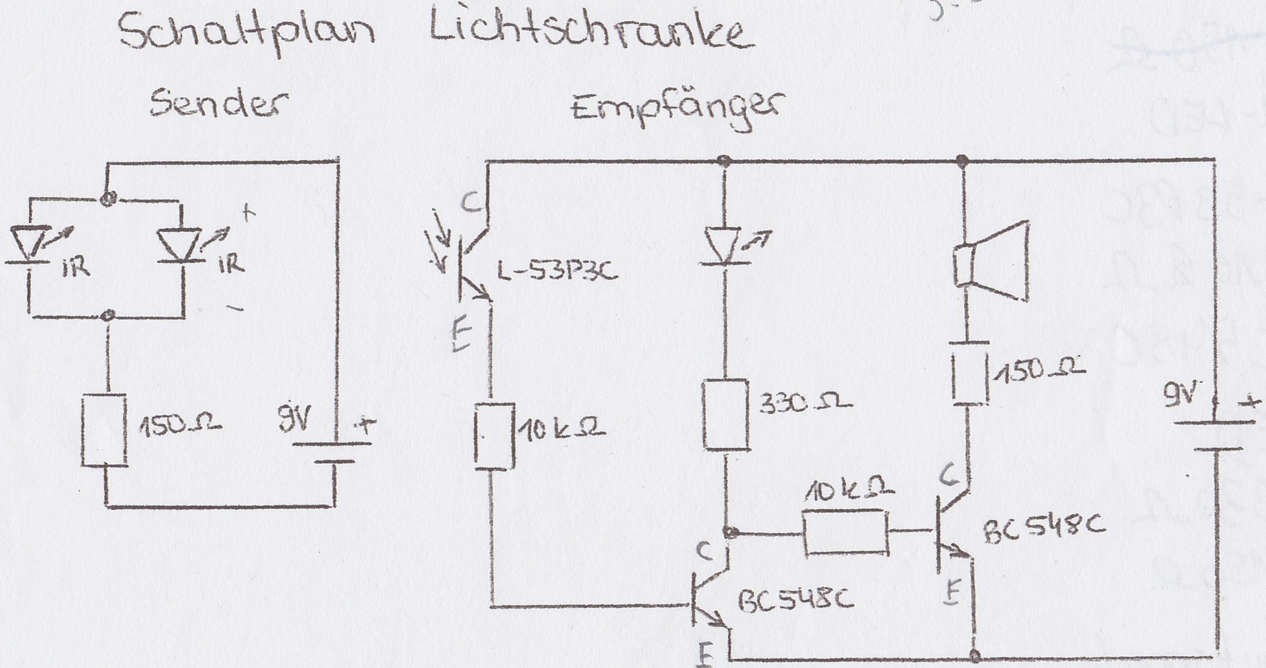 Eine Lichtschranke ist wie der Name ja schon sagt eine Schranke aus Licht. Die IR-Diode sollte in dieser Beschaltung einen Peak-Strom von 300mA vertagen. Die Schaltung wird anhand des Planes nachgebaut dabei dürfte es keine größeren Probleme geben.